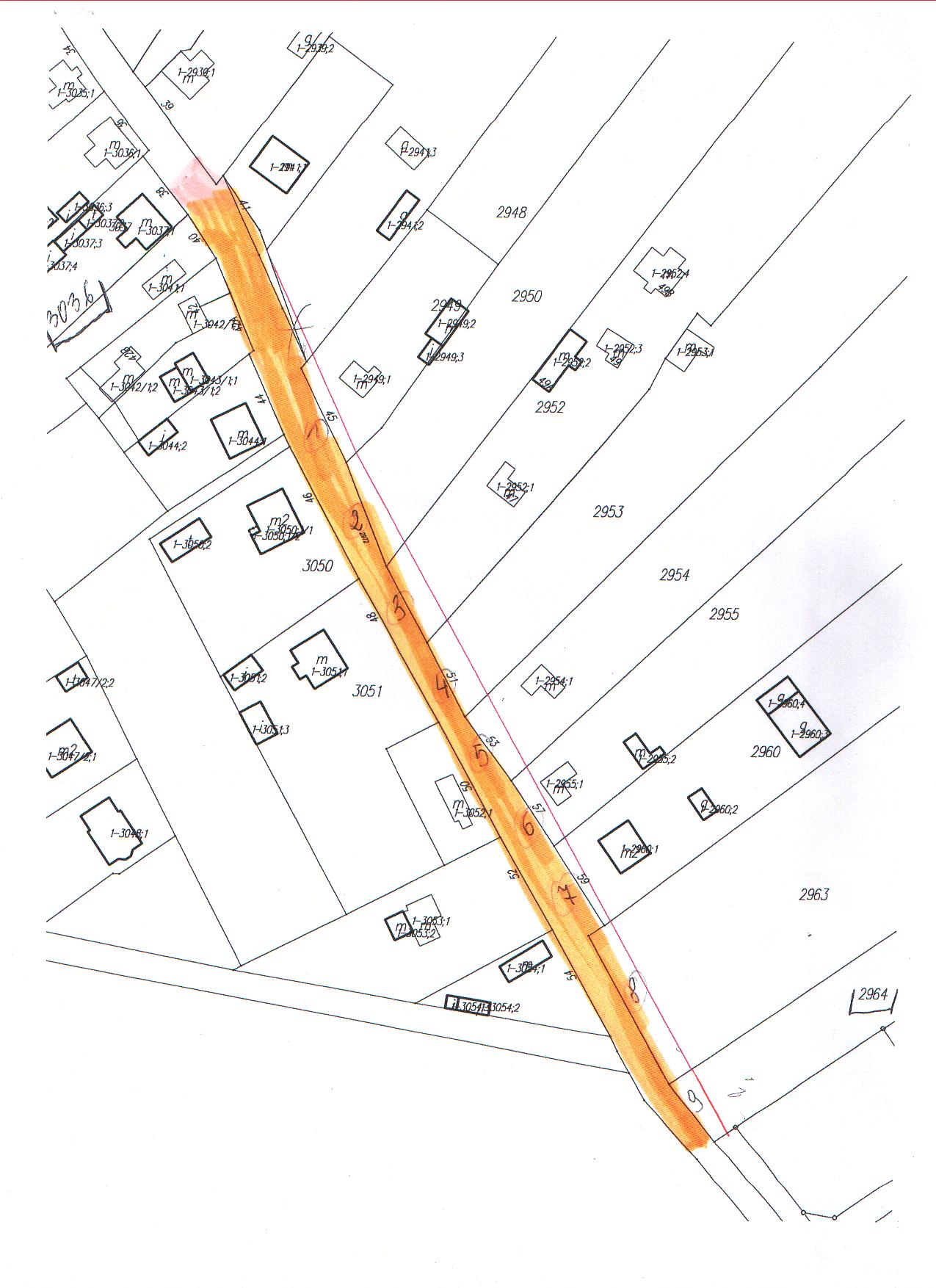 10) mapę ewidencyjną z oznaczeniem zakresu robót i wykaz właścicieli nieruchomości, z naniesioną (na czerwono) zajętością terenu pod projektowaną drogę,