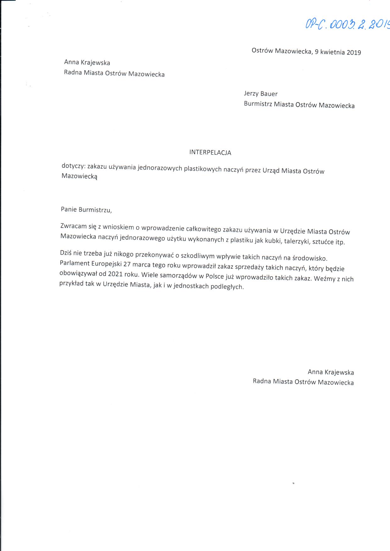 dot. rezygnacji z użytkowania przez Urzad Miasta Ostrów Mazowiecka naczyń jednorazowego użytku