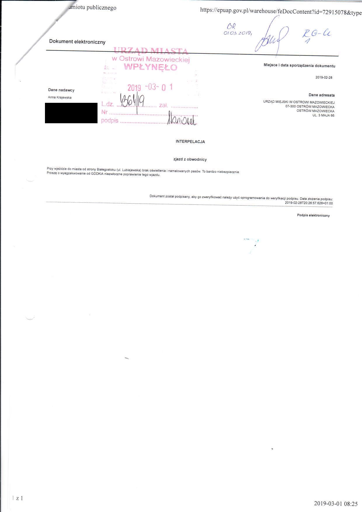 dot. braku oświetlenia i poziomych znaków na wiadukcie -Lubiejewska