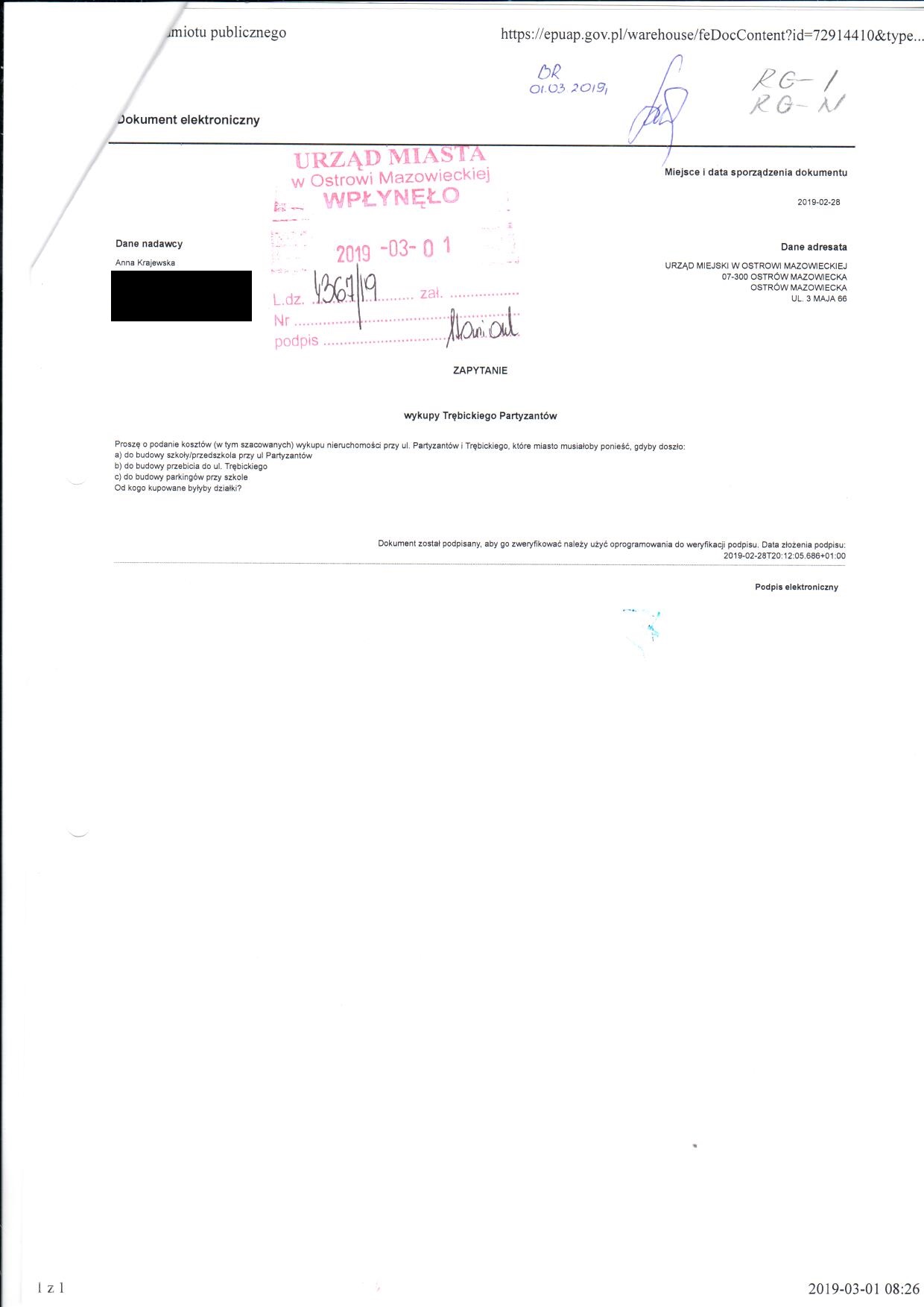 dot. kosztów wykupu nieruchomości przy ul. Partyzantów i ul. Trebickiego