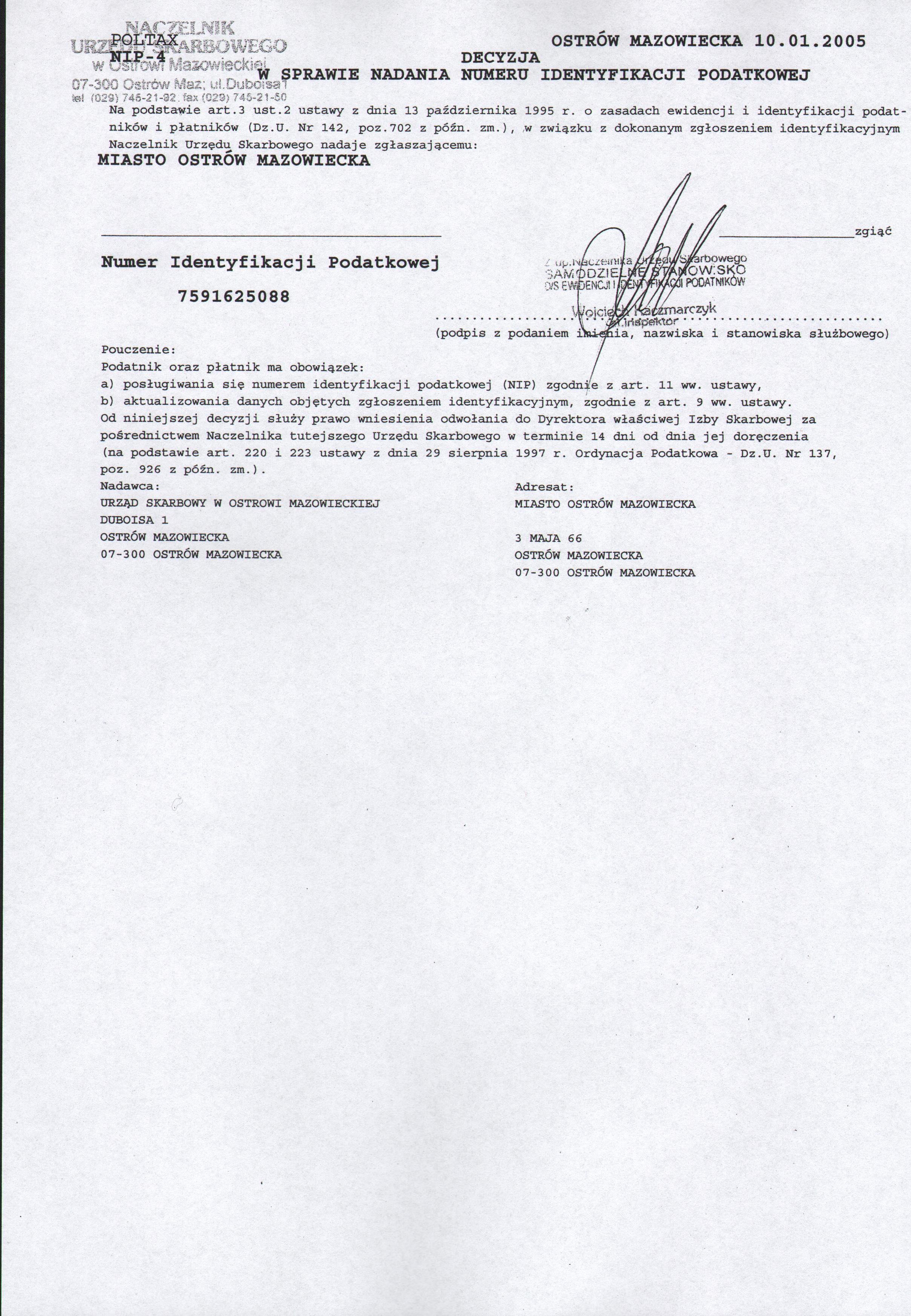 Decyzja w sprawie nadania numeru identyfikacji podatkowej