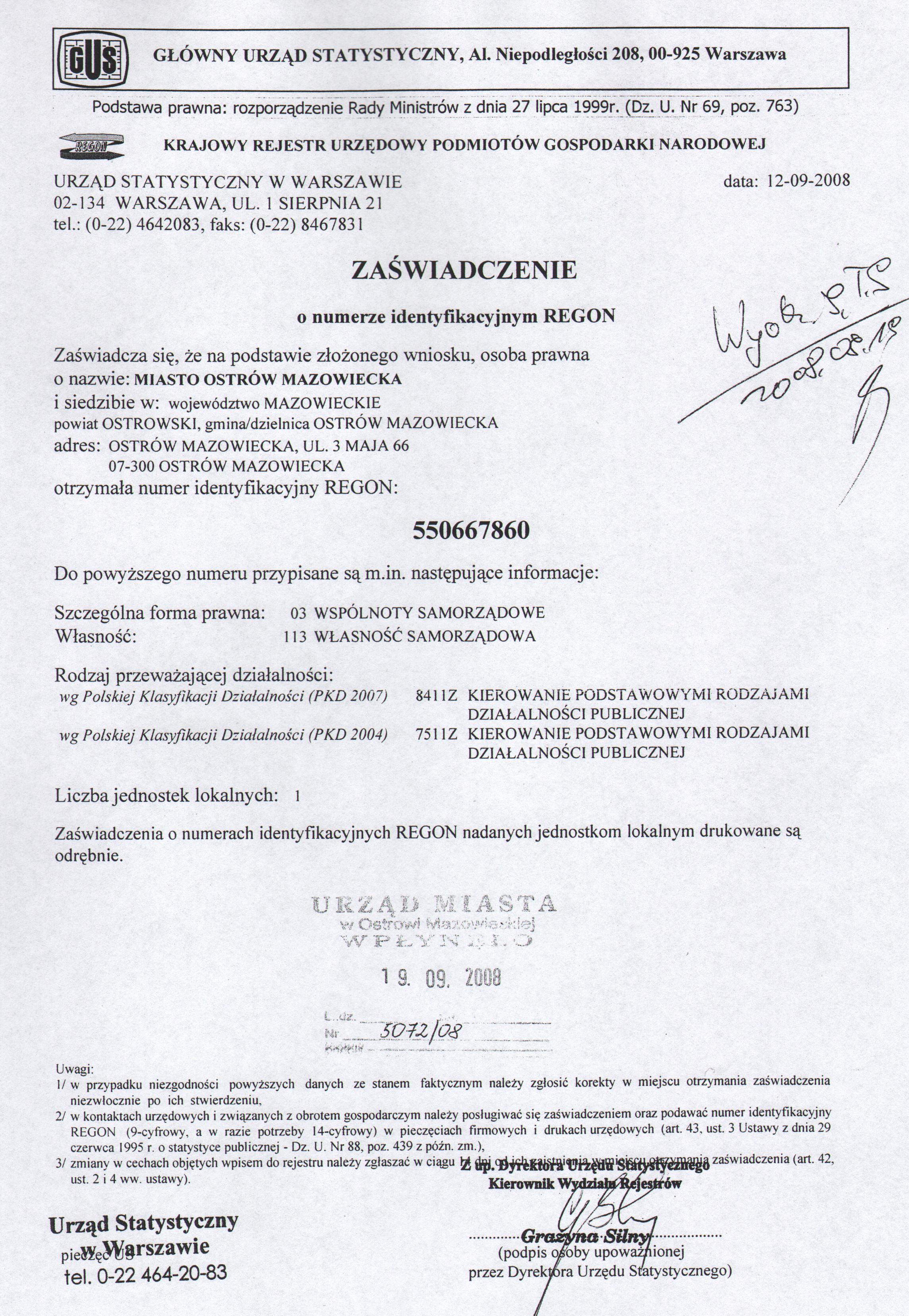 Zaświadczenie o numerze identyfikacyjnym REGON